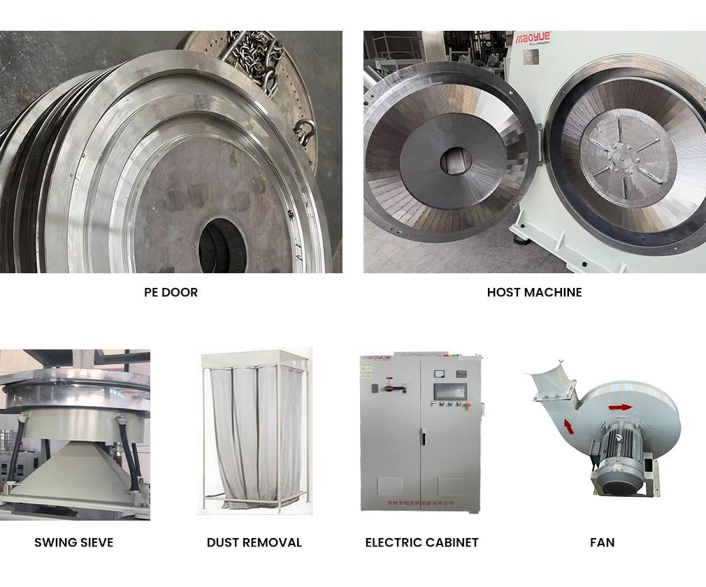 The Mao Yue 500-type polymer masterbatch pulverizer is suitable for a wide range of high-precision fine powder production scenarios and serves as an ideal solution for the masterbatch and modified plastics industry. In masterbatch production, it efficiently grinds PE, PP, ABS, PS, PC, and other base materials, ensuring high dispersibility of pigments and additives for uniform coloring with no color difference, black spots, or fisheyes, delivering premium output quality. In the field of functional masterbatch and modified plastics, it excels at processing flame-retardant, antistatic, reinforced, conductive, and other high-performance masterbatches that demand extreme fineness and uniformity, with narrow particle size distribution and excellent dispersibility that significantly enhance downstream product performance. Additionally, it is widely used in recycling and re-granulation, quickly pulverizing waste masterbatch scraps, injection/extrusion waste, and off-cuts for reuse, substantially reducing raw material costs; it also produces uniform 30–60 mesh rotomolding powder and SPC flooring core layer powder perfectly suited for rotational molding processes and flooring substrate production. For laboratories or small-batch trial production, its compact design, high-precision temperature control, and flexible fineness adjustment make it the top choice for new formula validation, sample development, and small-scale masterbatch testing lines. Regardless of production scale, the Mao Yue 500-type consistently delivers stable, efficient, and cost-effective fine powder solutions to meet diverse application needs.